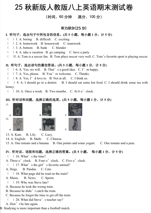 【2025秋新版】新人教版八上英语期末测试卷