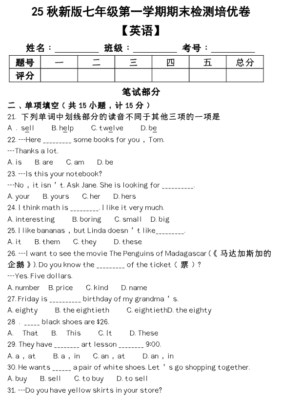 【2025秋新版】七年级第一学期英语期中测试卷