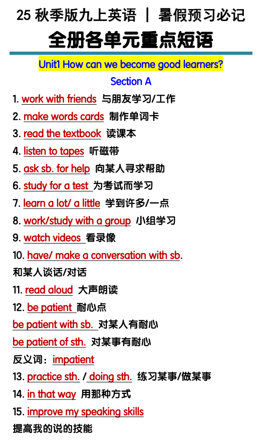 【2025秋新版】九上英语暑假预习必记:全册各单元重点短语