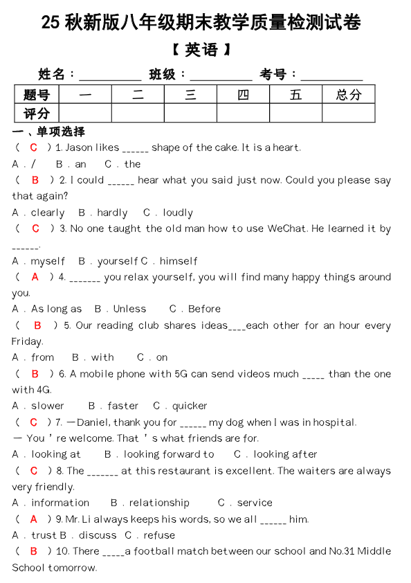 【2025秋新版】八年级【英语】上册期末教学质量检测试卷(含答案)