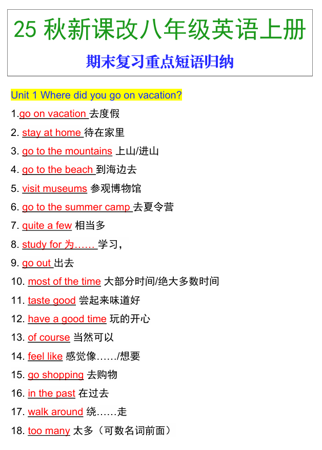 【2025秋新版】八年级上册英语期末必背重点短语归纳