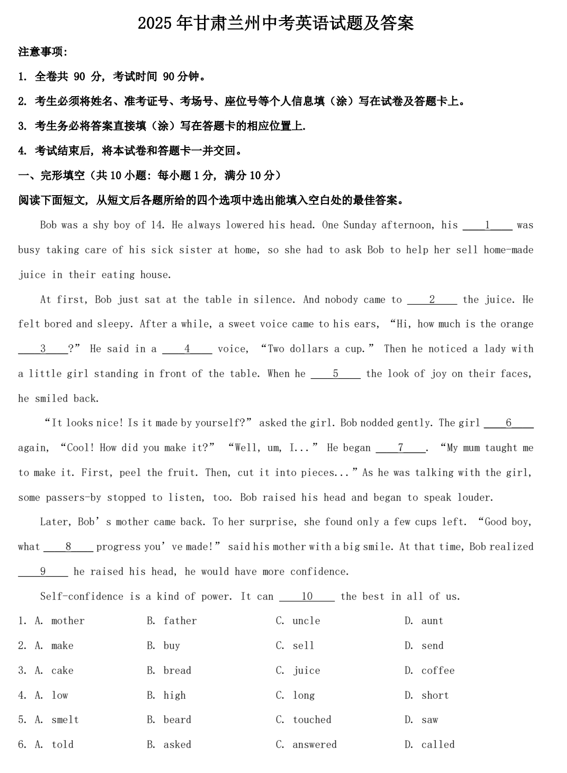2025年甘肃兰州中考英语试题及答案