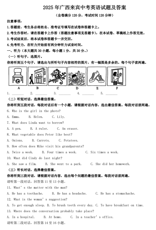 2025年广西来宾中考英语试题及答案