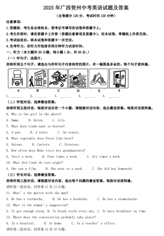 2025年广西贺州中考英语试题及答案