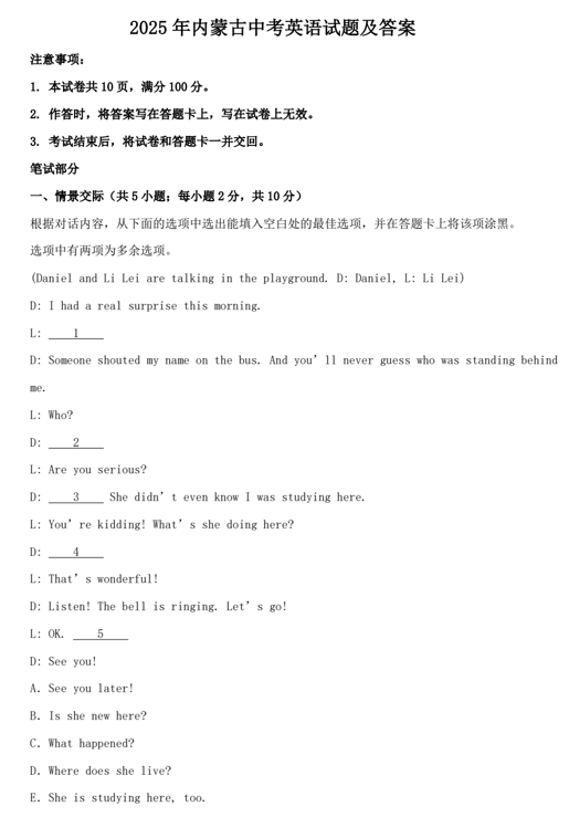 2025年内蒙古中考英语试题及答案