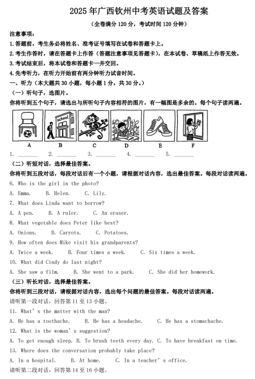 2025年广西钦州中考英语试题及答案