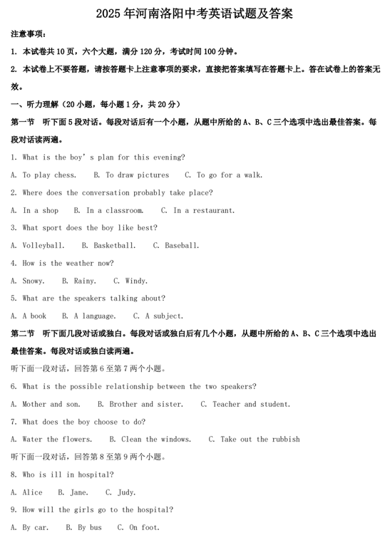 2025年河南洛阳中考英语试题及答案